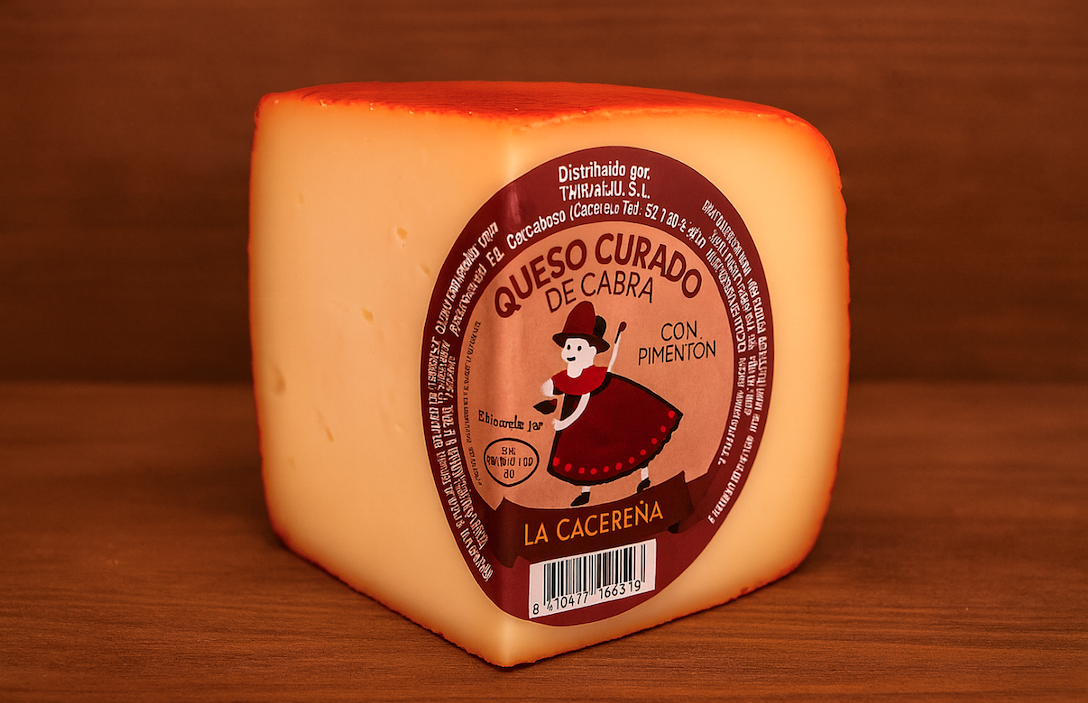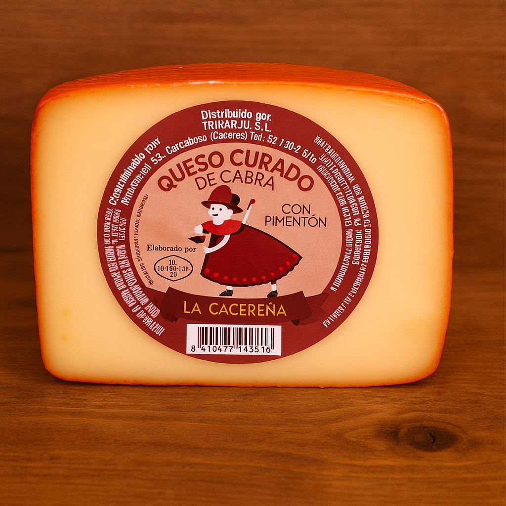Queso artesanal de cabra curado con pimentón en la corteza. Sabor profundo, toque ahumado y una textura cremosa que se funde en el paladar.